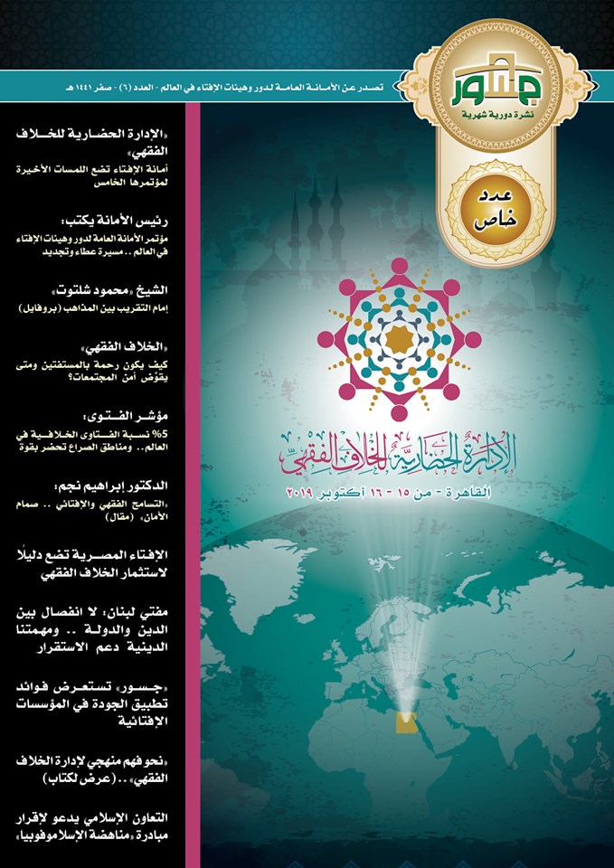 تزامنًا مع قرب انعقاد المؤتمر العالمي الخامس الذي تعد له الأمانة العالمة لدور وهيئات الإفتاء في العالم تحت عنوان "الإدارة الحضارية للخلاف الفقهي" في 15-16 من أكتوبر المقبل، صدر العدد السادس من النشرة الدورية الشهرية "جسور" في ثوب خاص ليطوف على مشهد الخلاف الفقهي في العالم الإسلامي، ويبرز معالم أهم القضايا الجدلية على الساحة الإفتائية والفقهية وكيفية استثمار الاختلاف الفقهي في نفع الناس وتيسير حياتهم، ويعرض غيضًا من فيض المستجدات في هذا الحقل الذي طالما دار السجال حوله، كما يسوق العدد كثيرًا من المعلومات والقضايا المتسقة مع موضوع مؤتمر أمانة الإفتاء المرتقب انعقاده منتصف أكتوبر.