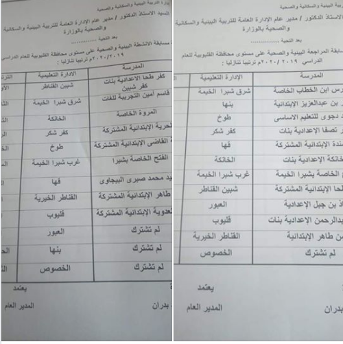 حصدت مدرستين من مدارس إدارة شرق شبرا الخيمة التعليمية مركز اول وثاني على مستوى المحافظة فى مسابقة المراجعة البيئية والصحية ومسابقة الأنشطة البيئية والصحية للعام ٢٠٢٠/٢٠١٩م وهما مدرسة ابن الخطاب الخاصة ومدرسة قاسم أمين الرسمية للغات لفوزها