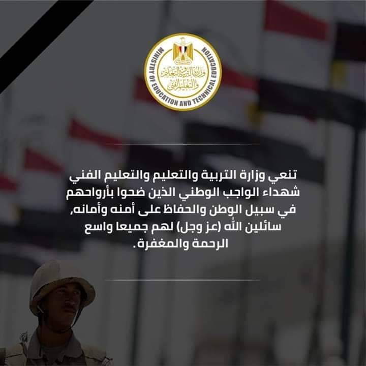 نعت وزاره التربية والتعليم والدكتور طارق شوقى وزيرالتربيه والتعليم والتعليم الفني وكافة العاملين بديوان عام الوزارة والمديريات التعليمية، شهداء الوطن والذين استشهدوا مساء أمس الخميس فى عملية إرهابية ببئر العبد.