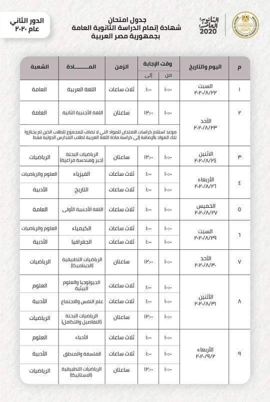 أعلن الدكتور طارق شوقى وزير التربيه والتعليم جدول امتحانات الدور الثانى لطلاب الثانويه جدول امتحانات "الدور الثاني" لشهادة إتمام الدراسة الثانوية العامة للعام الدراسي ٢٠١٩- ٢٠٢٠ والتي ستبدأ يوم ٢٢ / ٨ / ٢٠٢٠.