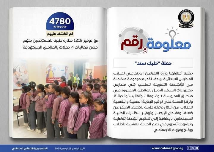 أطلقت وزارة التضامن الاجتماعي حملة "خليك سند" داخل المدارس الابتدائية لطلاب تلك المناطق، تهدف الحملة إلى تقديم خدمات صحية ونفسية للطلاب من خلال قوافل طبية للكشف المبكر عن ضعف وفقدان الإبصار، وتوفير نظارات طبية للمستحقين، إلى جانب أنشطة تفاعلية وترفيهية لدعم الصحة النفسية والوعي الاجتماعي للطلاب، وتستهدف الحملة نحو 5500 طالب وطالبة في مناطق المحروسة 1 و2، ومعًا، وأهالينا، والخيالة.