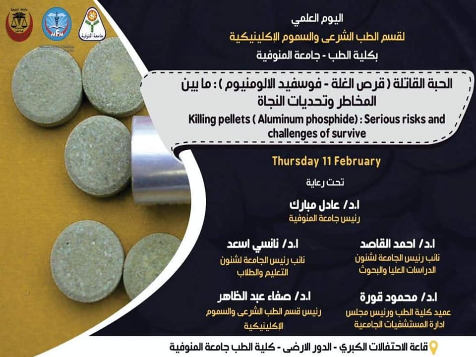 يعقد قسم الطب الشرعي و السموم الإكلينيكية بكلية الطب جامعة المنوفية يوم علمي تحت عنوان الحبة القاتلة ( قرص الغلة- فوسفيد الألومنيوم):ما بين المخاطر وتحديات النجاة وذلك يوم الثلاثاء 11 فبراير بقاعة الاحتفالات بالدور الارضي بكلية الطب ، تحت رعايةالدكتور عادل مبارك رئيس جامعة المنوفية والدكتور أحمد القاصد نائب رئيس الجامعة لشئون الدراسات العليا والدكتورة نانسي أسعد نائب رئيس الجامعة لشئون التعليم والطلاب والدكتور محمود قورة عميد كلية الطب ورئيس مجلس ادارة المستشفيات الجامعيةو برئاسة صفاء عبد الظاهر أمين رئيس قسم الطب الشرعي والسموم الإكلينيكية