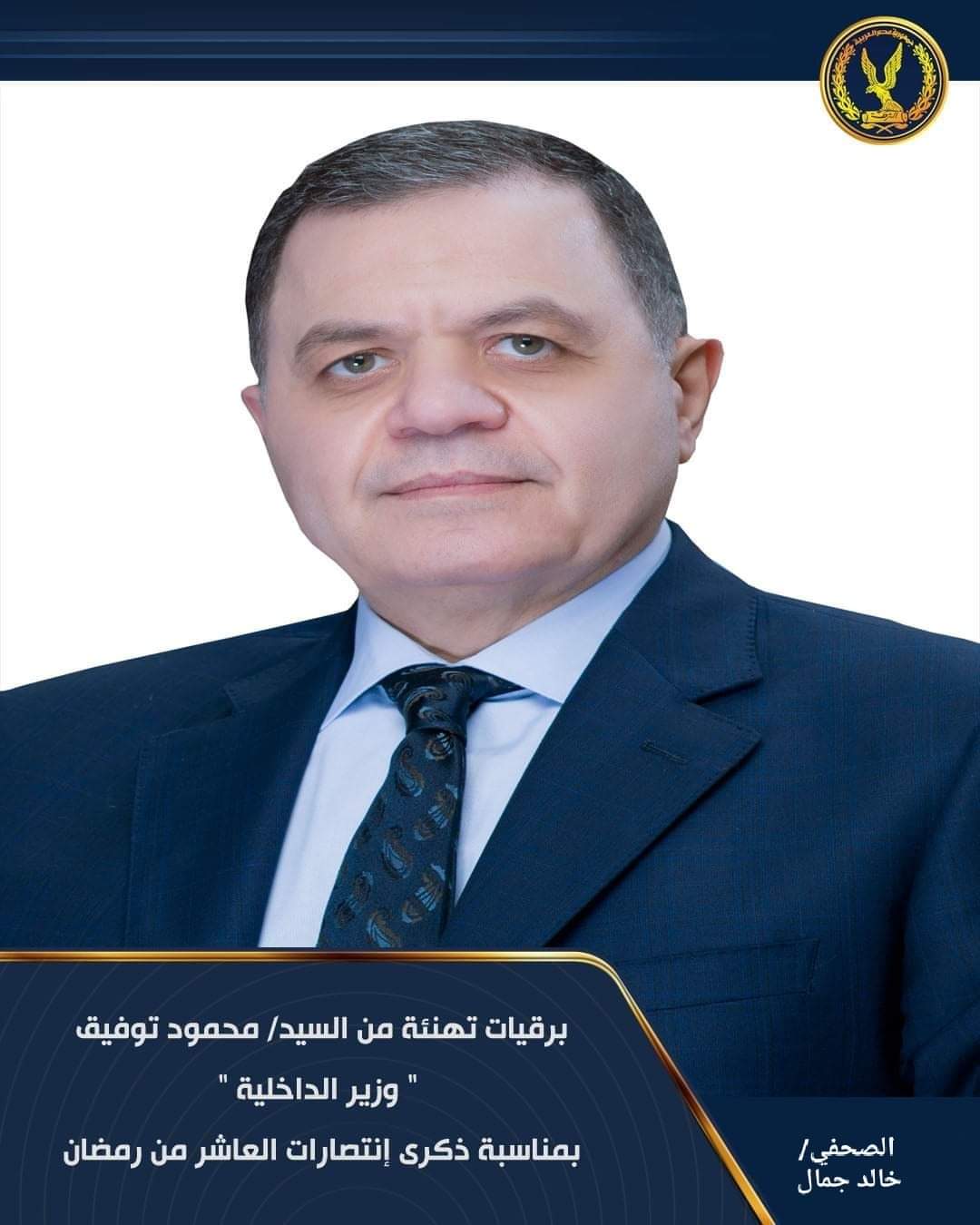 بمشاعر يملؤها الإعزاز والتقدير يسعدنى وهيئة الشرطة بمناسبة الإحتفال بذكرى العاشر من رمضان أن نبعث لسيادتكم والقادة والضباط وضباط الصف والصناع العسكريين والجنود عن صادق الأمنيات بدوام السداد والتوفيق.