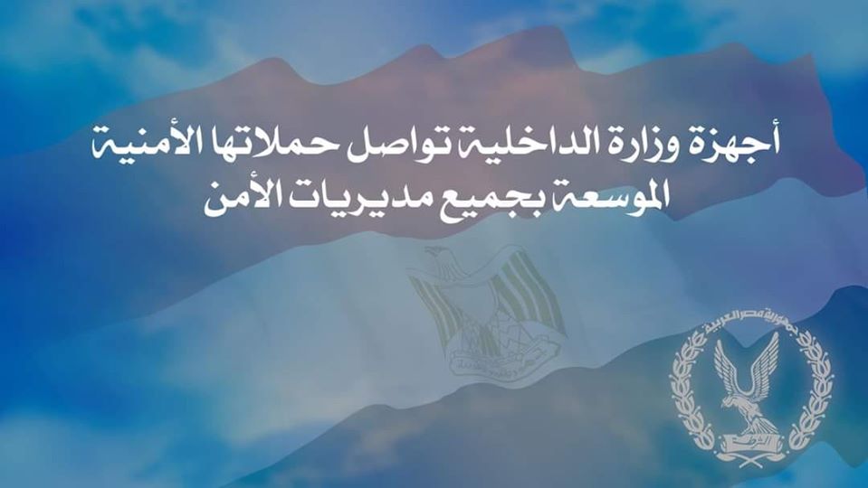فى إطار مواصلة الحملات الأمنية المكثفة لمواجهة أعمال البلطجة وضبط الخارجين على القانون وحائزى الأسلحة النارية والبيضاء وإحكام السيطرة الأمنية .. فقد قامت أجهزة وزارة الداخلية بمختلف مديريات الأمن على مستوى الجمهورية بتوجيه حملة أمنية مكبرة أسفرت جهودها خلال 24 ساعة عن تحقيق النتائج الإيجابية التالية:-
