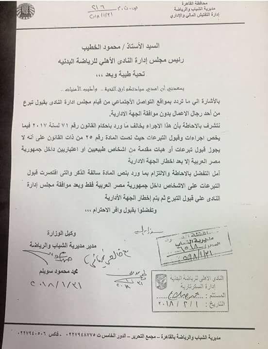 تنظر السبت القادم محكمة جنح قصر النيل محاكمة بيبو محمود الخطيب والعامري فاروق عن جريمة تلقيهما بشكل سري 260 مليون جنيه من تركي ال الشيخ بالمخالفة للقانون ولقيام بيبو بطلب وتلقي ستة ملايين جنيه تبرعات أجنبية بهدف التأثير في إنتخابات النادي الأهلي.