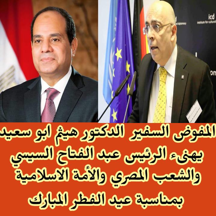 يبعث السفير الدكتور هيثم ابو سعيد المفوض بالشرق الأوسط للجنة الدولية لحقوق الانسان ورئيس وكالة الانباء الدولية لحقوق الانسان بالتهنئة لفخامة الرئيس عبد الفتاح السيسي والقيادة المصرية وجميع مؤسسات الدولة والشعب المصري العظيم والأمة الإسلامية بمناسبة عيد الفطر المبارك وقال يسعدني ويشرفني أن أتقدم لسيادة الرئيس عبد الفتاح السيسي والشعب المصري الكريم بالأصالة عن نفسي وبالإنابة عن وكالة الانباء الدولية لحقوق الانسان بخالص التهاني وأصدق الأماني بقضاء عيد مبارك وأيام سعيدة وأسأل الله عز وجل أن يحفظ مصر ورئيسها و جيشها واجهزتها الأمنية وشعبها من كل مكروه وسوء وأن يجمعنا دائما على كل الخير ، وأن يحقق لنا كل ما نصبوا إليه.
