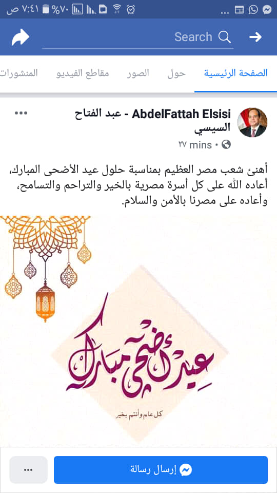 حيث كتب السيسي على الصفحة الرسمية على موقع التواصل الاجتماعي "فيس بوك" : أهنئ شعب مصر العظيم بمناسبة حلول عيد الأضحى المبارك، أعاده الله على كل أسرة مصرية بالخير والتراحم والتسامح، وأعاده على مصرنا بالأمن والسلام".