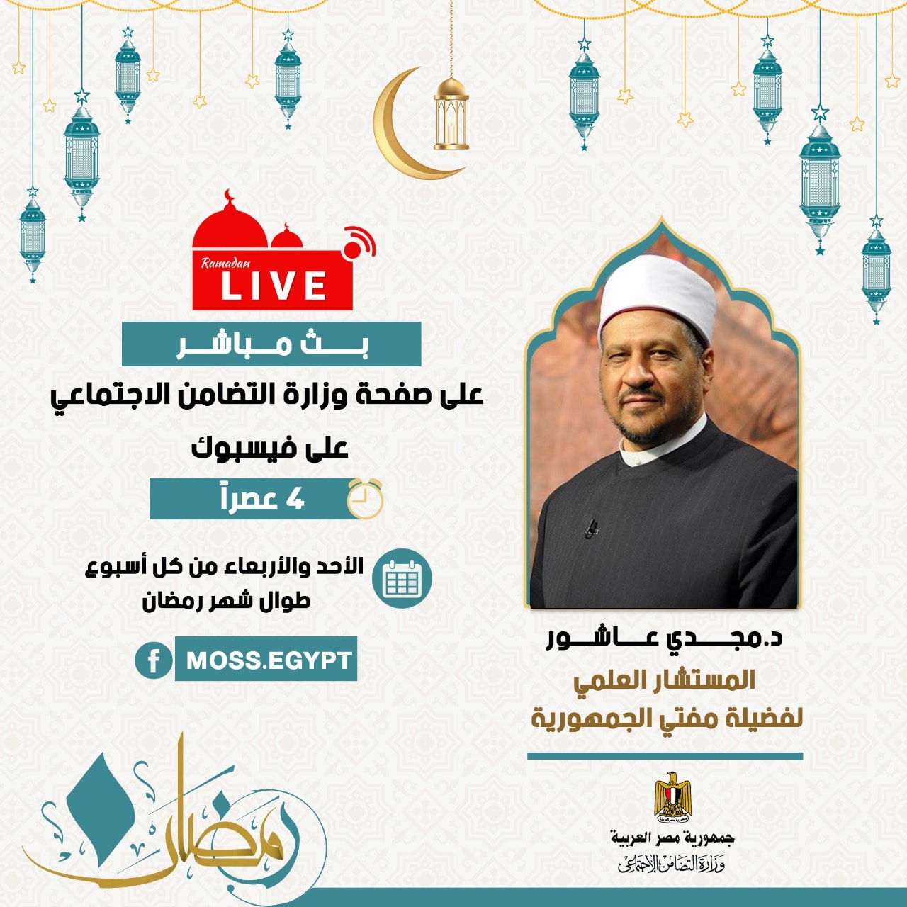 تستضيف وزارة التضامن الاجتماعى الشيخ مجدى عاشور المستشار العلمى لمفتى الجمهورية يومى الأحد والأربعاء أسبوعيًا طوال شهر رمضان المبارك فى تمام الساعة الرابعة عصرًا ولمدة ساعة، وذلك فى بث مباشر على صفحة وزارة التضامن الاجتماعى الرسمية على موقع التواصل الاجتماعى« فيس بوك».