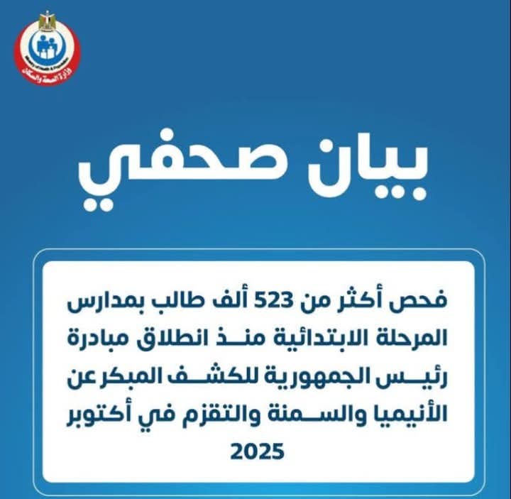 أعلنت وزارة الصحة والسكان استئناف العمل بمبادرة رئيس الجمهورية للكشف المبكر عن الأنيميا والسمنة والتقزم لدى طلاب المرحلة الابتدائية، حيث تم فحص 523 ألفًا و160 طالبًا في مختلف المدارس الحكومية والخاصة وذلك منذ إطلاقها العام الدراسي الحالي يوم 5 اكتوبر 2025، يأتي ذلك في إطار حرص الدولة علي صحة وسلامة الطلاب.