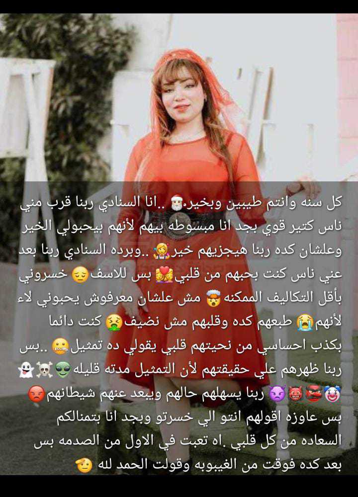 وأضافت أنه مطلوب الحب بجد اللي ميتعوضش وده الحب الأول، دلوقتي علشان تلاقي حد يحبك صعب أو لو لقيته للآسف تلاقيه مزيف مغشوش بس على وجوه ملونة، وجوه بترسم الابتسامة، علشان بس تستفاد منك ...الناس هي الناس بس قلوبهم أتغيرت، ممكن من ضغوط الحياة، ممكن من الفقر السأئد والله مش عارفة، مش عاوزه أحكم على حد بجد، ولا أقول دي تربية أو دين، الناس نسيت أن في تربية ونسيت ربهم، بس نفسي الناس ترجع تاني زي أول حب.