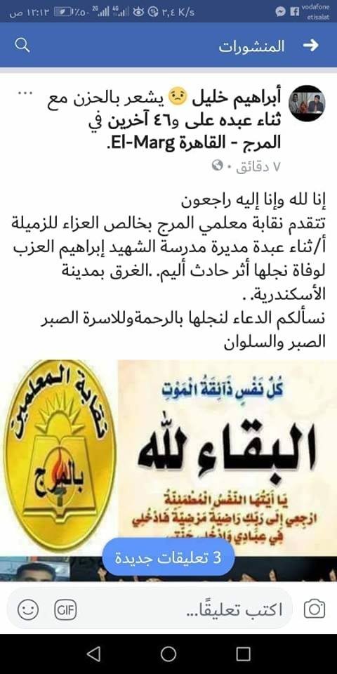 وأكد المعناوى انه صدم من الخبر المنشور. حيث قامت نقابة معلمى المرج بنشر خبر وفاة نجله وتقديم العزاء لحرمه السيدة ثناء عبده على مدير مدرسة الشهيد ابراهيم العزب الاعدادية بنات التابعة لإدارة المرج التعليمية.