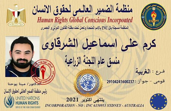 يتقدم المهندس اسماعيل على الشرقاوى بالتهنئة القلبية للاستاذ/كرم علي اسماعيل الشرقاوي لتعيينه منسق عام اللجنه الزراعية بمنظمه الضمير العالمى لحقوق الإنسان التابعه للأمم المتحده فرع الغربية وكل الشكر للدكتور مينا يوحنا يوسف مدير عام منظمة الضمير العالمي لحقوق الإنسان لاختياره له منسق عام اللجنة الزراعية بالغربية نظرا لما يقوم به من دعمه للشباب واهتمامه بالمبادرات الشبابية التي يقوم بها لدعم الشباب لأن مصر بها طاقات كبيرة يجب استخدامها في مجال الزراعه من أجل دعم الشباب و المشاركه فى خطه الدوله لتمكين الشباب من استصلاح الأراضي تحت رعاية فخامه الرئيس عبد الفتاح السيسى رئيس الجمهوريه ومحاربة الأفكار المتطرفة التي تولد العنف وحتي يكون للشباب دور في الزراعة واستصلاح الاراضي الصحراوية والتنمية والبناء والتطوير لمصرنا الحبيبة وأنه له طموحات كثيرة سوف يقوم بدعمها وتقديمها للمنظمة وهي مساعدة الشباب في طموحهم حتي يكونوا هم نواة المستقبل وبتلك الصفات الحميدة فهو أهل لهذا المنصب لما له من دور فعال فى دعم الشباب والكثير من الاعمال الخيريه في محافظة الغربية