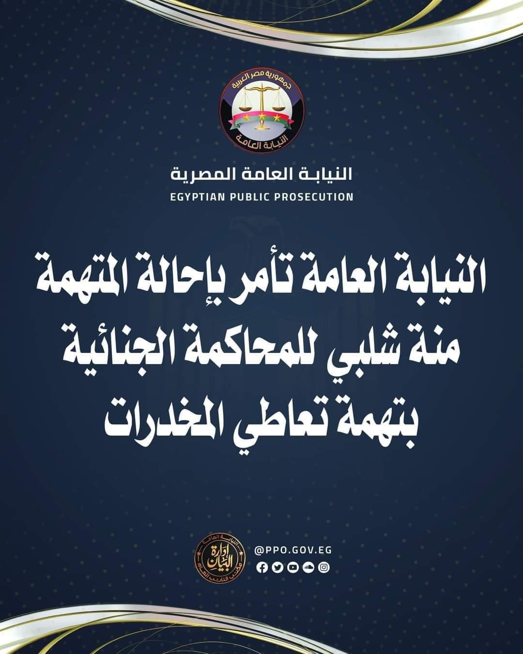 أمرت النيابة العامة اليوم بإحالة المتهمة/ منة شلبي للمحاكمة الجنائية؛ لمعاقبتها على ما أُسند إليها من إحرازها جوهر الحشيش المخدِّر بقصد التعاطي في غير الأحوال المصرَّح بها قانونًا، وقد أقامت النيابة العامة الدليلَ قِبَلها من شهادة خمسة شهود على الواقعة، وما توصلَّت إليه تحريات الشرطة، وما ثبت بتسجيلات آلات المراقبة بمحلِّ ضبطها، فضلًا عمَّا أسفر عنه فحص المعمل الكيماويّ للمضبوطات المعثور عليها بحوزتها.