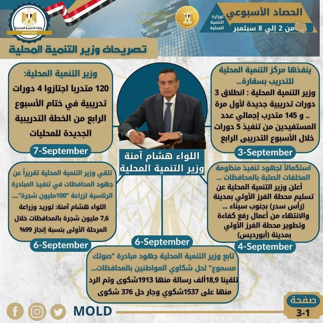أصدر المركز الإعلامي التابع لوزارة التنمية المحلية، "الانفوجراف الأسبوعي" في نسخته الـ ٥١ حول حصاد أهم الأنشطة والفعاليات التي قام بها اللواء هشام آمنة وزير التنمية المحلية، خلال الأسبوع الماضي في الفترة من ٢ حتى ٨ سبتمبر الجاري، حيث نستعرض أبرزها في التقرير التالي الذي نشرته الصفحة الرسمية لوزارة التنمية المحلية على موقع التواصل الاجتماعي "فيس بوك" من خلال انفوجراف يرصد أبرز تلك الأنشطة التي جاءت كالتالي:
