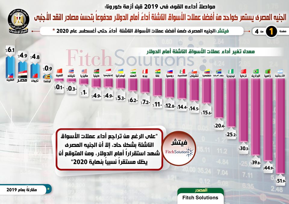 لتأتي بعد ذلك توقعات وكالة "فيتش" باستمرار الجنيه المصري ضمن الأفضل أداءً بين عملات الأسواق الناشئة عام 2021، مقارنة بعام 2019.
