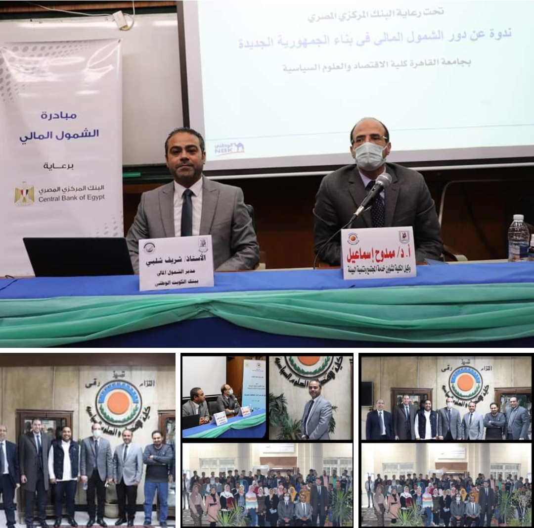 نظمت وزارة الشباب والرياضة بالتعاون مع كلية الأقتصاد والعلم السياسية- جامعة القاهرة، ندوة تثقيفية تحت عنوان "دورالشمول المالى في بناء الجمهورية الجديدة"، تحت رعاية بنك الكويت الوطني، وبحضور الأستاذ دكتور ممدوح اسماعيل، وكيل الكلية لشؤون خدمة المجتمع وتنمية البيئة، وذلك في إطار المساهمة في زيادة الوعي المالي لكافة فئات المجتمع لتحقيق أهداف الشمول المالي ورؤية سيادة رئيس الجمهورية عبد الفتاح السيسي مصر 2030.