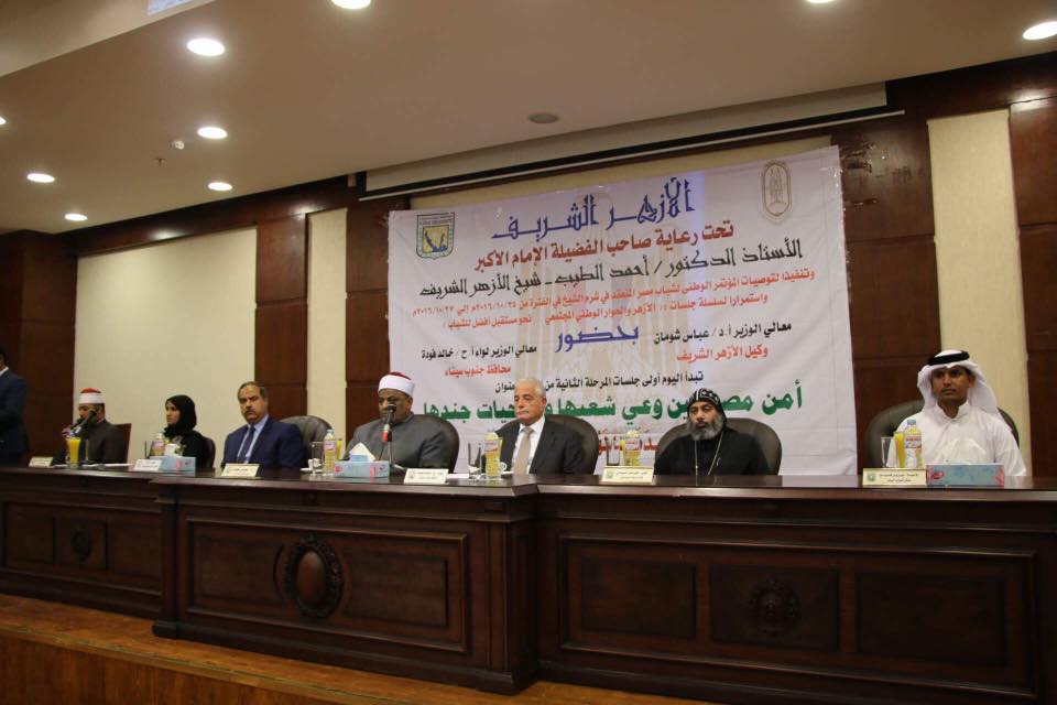 تحت رعاية الدكتور أحمد الطيب شيخ الأزهر الشريف إنطلقت فعاليات مؤتمرالحوار المجتمعي الثاني تحت عنوان " "أمن مصر بين وعى شعبها وتضحيات جندها" والذي تستضيفه مدينة الشباب والرياضة بمدينة شرم الشيخ، في إطار الحوار المجتمعي الذي يحرص الأزهر الشريف على تفعيله لحماية الأمن القومي المصري، بحضور الأستاذ الدكتور عباس شومان وكيل الأزهر، نائبا عن شيخ الأزهر،واللواء خالد فودة، محافظ جنوب سيناء، و اللواء أحمد طايل مساعد الوزير مدير أمن جنوب سيناء، والأنبا فلوباتير ممثل الكنيسة بالمحافظة، نائبا عن الأنبا أبولو أسقف جنوب سيناء،وجبريل فتيح ممثل شباب البدو، وفاطمة السيد ممثلة فتيات البدو، واللواء نادر عشماوي، سكرتير عام المحافظة المساعد، ورؤساء المدن ووكيل وزارة الأوقاف بالمحافظة، ومدير عام المنطقة الأزهرية، ومديري عموم مديريات التضامن الإجتماعي، والتربيه والتعليم، والشباب والرياضة وادارة الوعظ بجنوب سيناء، وساره صالح عضو مجلس النواب عن جنوب سيناء، ومشايخ وعواقل جنوب سيناءوممثلي الجهاز التنفيذي واللجنة العليا للشباب وحوالي 450 شاب وفتاة .