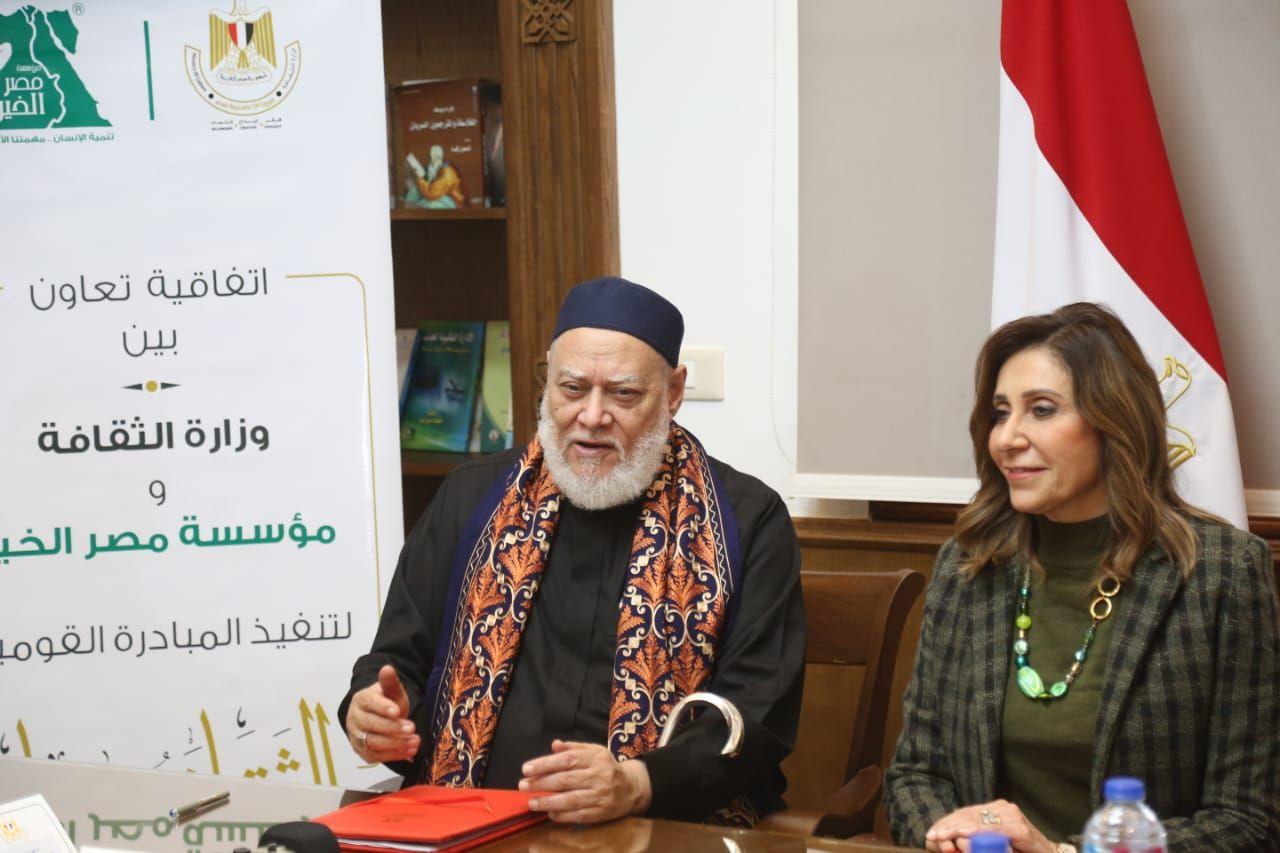 وقعت وزيرة الثقافة، الدكتورة نيفين الكيلاني وفضيلة الشيخ الدكتور علي جمعة، رئيس مجلس أمناء مؤسسة مصر الخير، بروتوكول تعاون بين وزارة الثقافة ومؤسسة مصر الخير، اليوم الأحد، بمقر المجلس الاعلى للثقافة بدار الأوبرا المصرية، في إطار مبادرة "الثقافة حياة".