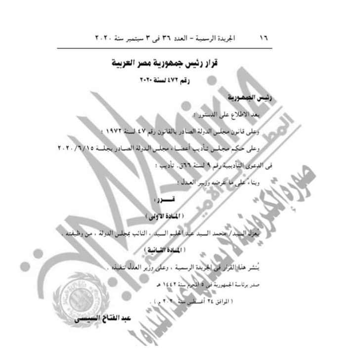 قراراً للرئيس عبد الفتاح السيسي، يحمل رقم 472 لسنة 2020، بعزل محمد السيد عبد الحليم السيد النائب بمجلس الدولة من وظيفته.