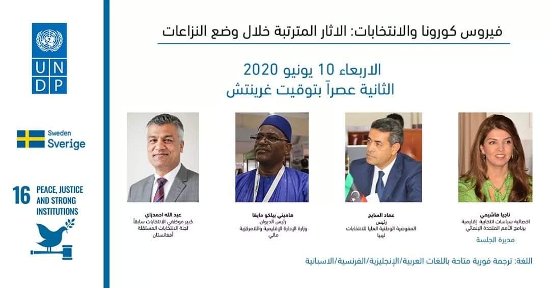 نظم برنامج الأمم المتحدة الإنمائي، محاضرة عبر الدوائر الالكترونية بعنوان "أثر فيروس كورونا على الانتخابات" ،والآثار المترتبة عليه ، في ظل مواجهة العديد من الدول حول العالم مخاوف بشأن إجراء انتخابات شفافة وسلمية و مراعاة ضمان الصحة العامة وسلامة الناخبين في نفس الوقت.