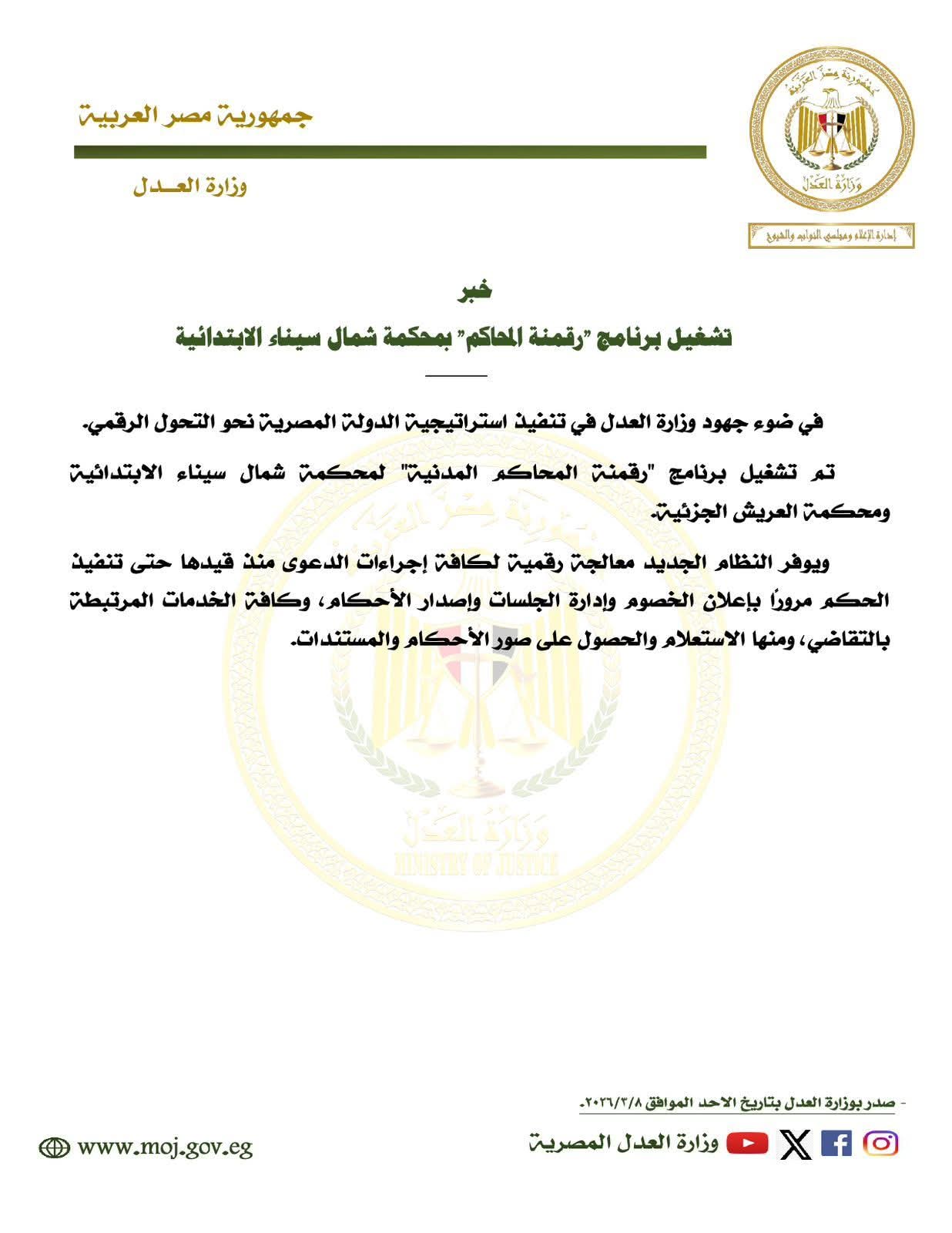 تم تشغيل برنامج "رقمنة المحاكم المدنية" لمحكمة شمال سيناء الابتدائية ومحكمة العريش الجزئية.
