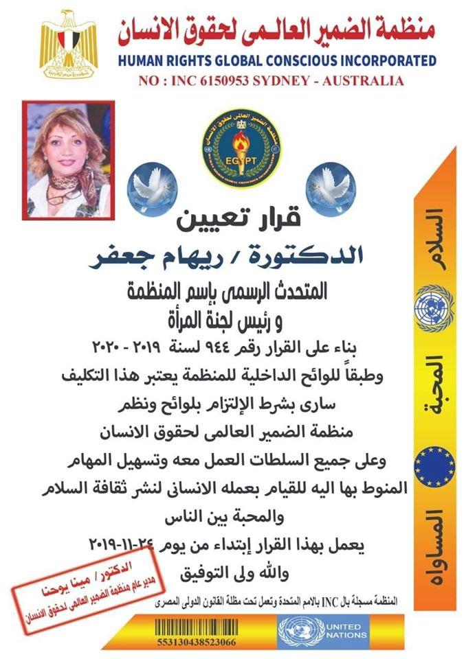 بناءا علي قرار الدكتور مينا يوحنا يوسف مدير عام منظمة الضمير العالمي لحقوق وبناءا علي القرار رقم ٩٤٤ لسنة ٢٠١٩--٢٠٢٠ وطبقا للوائح الداخلية للمنظمة تكليف الدكتورة. ريهام جعفر المتحدث الرسمي باسم المنظمة ورئيس لجنة المرأة يعتبر هذا التكليف ساري بشرط الالتزام بلوائح ونظم منظمة الضمير العالمي لحقوق الإنسان وعلي السلطات العمل معها وتسهيل المهام المنوط بها إليها لقيامها بعملها الانساني لنشر ثقافة السلام والمحبة بين الناس