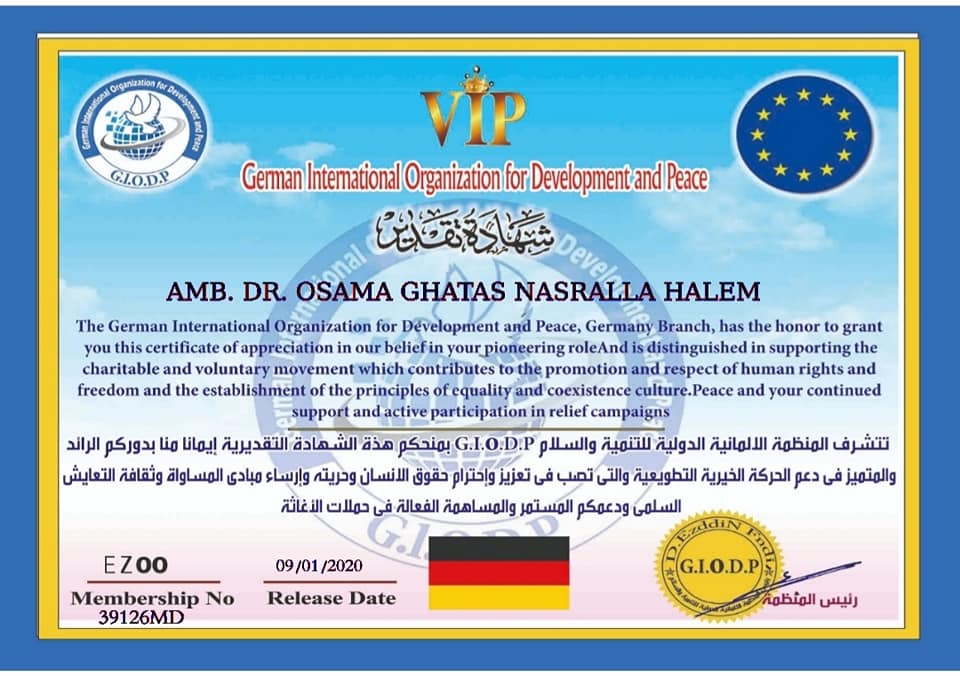 كرمت المنظمة الألمانية الدوليه الطبيب المصري"أسامة غطاس" ومنحته شهادة "نظرا لمجهوداته التي يقدمها لخدمة الوطن وذلك بعد الإحصائية وإستطلاع الرأي.