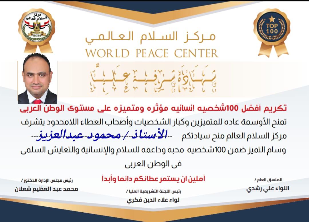 وقام مركز السلام برئاسة المستشار/ محمد عبد العظيم شعلان - رئيس مجلس الادارة والسيد اللواء/ علاء الدين فكري - رئيس اللجنة النشريعية العليا بمركز السلام العالمي وايضا السيد اللواء/ علي رشدي - المنسق العام وذلك بتكريم السيد الاستاذ/ محمود عبد العزيز - منسق الاتصال السياسي والامن القومي بوسام التميز ضمن افضل 100 شخصية محبة وداعمة للسلام والاسنانية والتعايش السلمي في الوطن العربي .