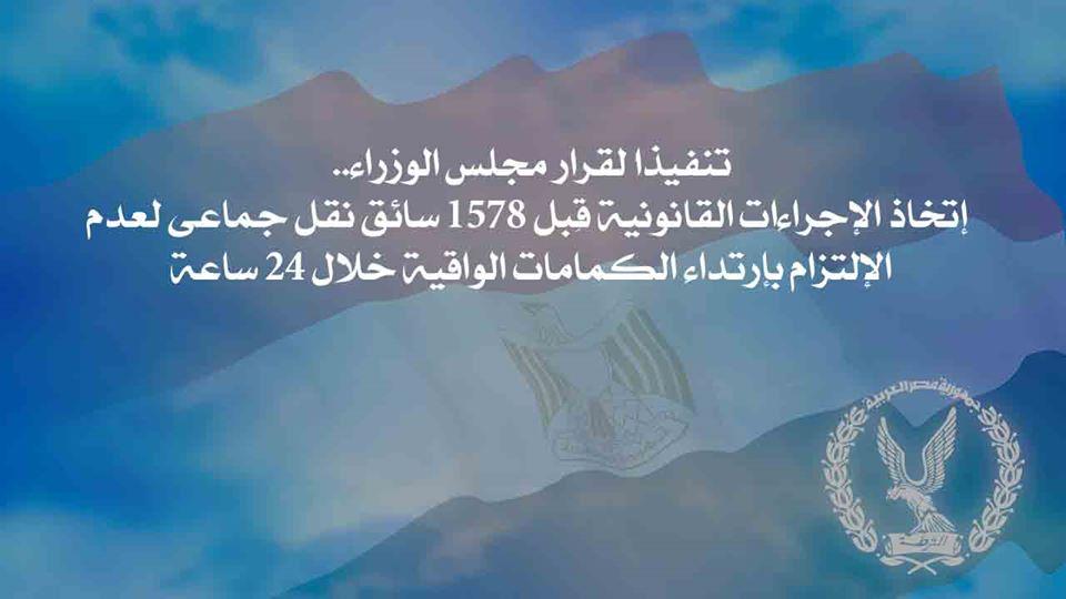 وفى ضوء صدور قرار مجلس الوزراء بشأن إتخاذ التدابير الإحترازية والوقائية لحماية المواطنين والحد من إنتشار فيروس "كورونا" والمتضمن إلزام جميع سائقى وسائل النقل الجماعى بإرتداء الكمامات الواقية.. فقد أسفرت جهود أجهزة وزارة الداخلية على مستوى الجمهورية، خلال 24 ساعة.. عن إتخاذ الإجراءات القانونية قِبل (1578) سائق نقل جماعى لعدم إرتداء الكمامة الواقية.
