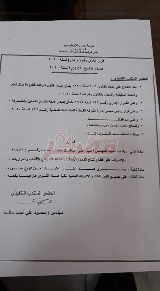 تتقدم جريدة مصر 24 بالتهنئة القلبية للمهندس/ نبيل علي عبد العال وذلك لثقة القيادة بالشركة السيد المهندس العضو المنتدب التنفيذي بشركة مصر للألومنيوم وصدور القرار الإداري رقم ٤٧١ لسنة ٢٠٢٠ بتاريخ ٢٠٢٠/١٢/٢٤ وتكليفه بالإشراف على قطاع إنتاج الفحم والاقطاب - قطاعات إنتاج الأقطاب والحراريات وعلي جميع القطاعات والإدارات المعنية تنفيذ هذا القرار كل فيما يخصه وندعو الله ان يوفقك في هذه المهمة في خدمة شركة مصر للألومنيوم بنجع حمادي بقنا الف مليون مبروك مزيد من الرقي والتقدم والنجاح ممدوح السنبسي مدير مكتب قنا