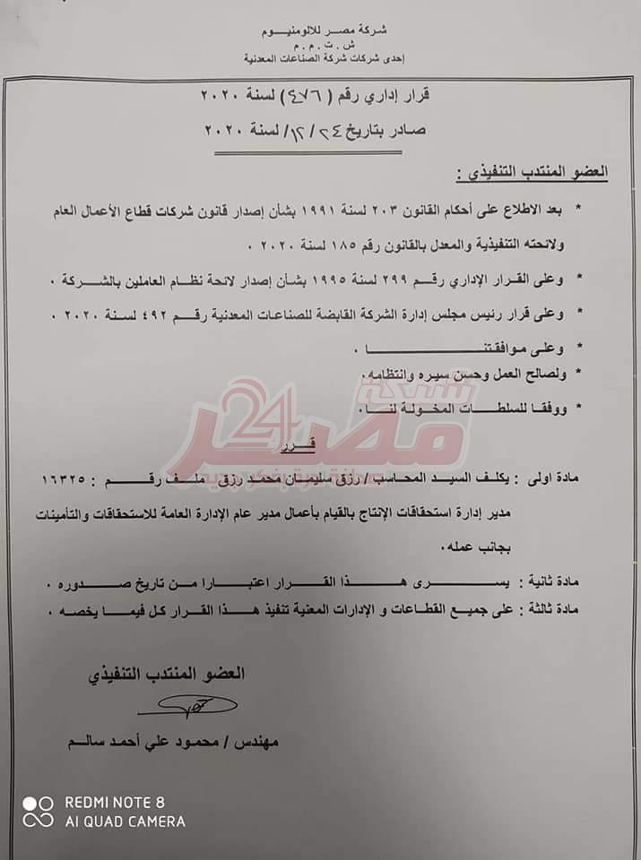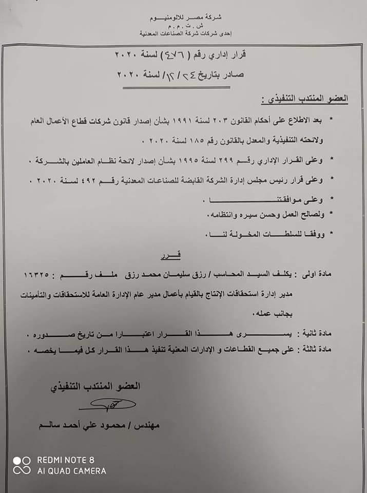 وتكليفه بالقيام بأعمال مدير عام الإدارة العامة للاستحقاقات والتأمينات بجانب عمله وعلي جميع القطاعات والإدارات المعنية تنفيذ هذا القرار كل فيما يخصه وندعو الله ان يوفقك في هذه المهمة في خدمة شركة مصر للألومنيوم بنجع حمادي بقنا الف مليون مبروك مزيد من الرقي والتقدم والنجاح