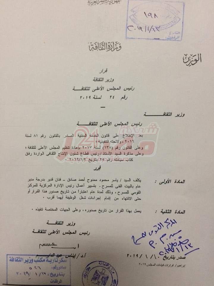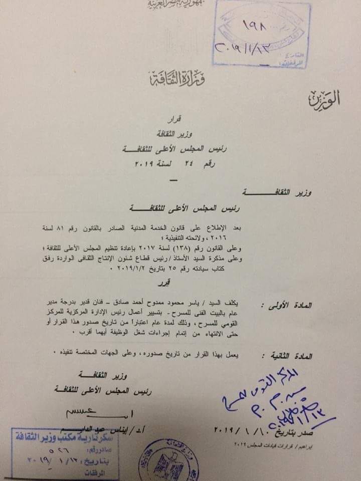 معالي وزيرة الثقافة الدكتورة /إيناس عبد الدايم تصدر قرار بتكليف الفنان الخلوق ياسر صادق لمنصب رئاسة المركز القومي للمسرح والموسيقى والفنون الشعبية