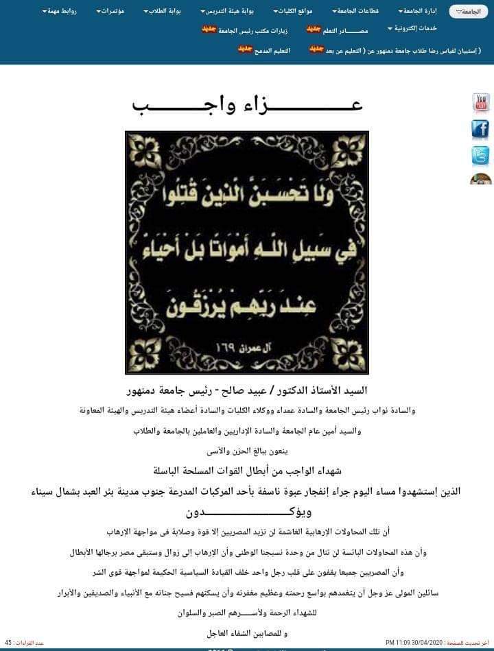 تقدم الدكتور عبيد صالح، رئيس جامعة دمنهور، وكافة النواب وعمداء الكليات بجامعة دمنهور بالتنديد للعمل الارهابى الغادر بشمال سيناء والذي نتج عنه استشهاد عدد من الجنود متقدمين للشعب المصرى واسر الشهاء بخالص العزاء فى هذا المصاب الاليم وحمى الله مصر وشعبها.