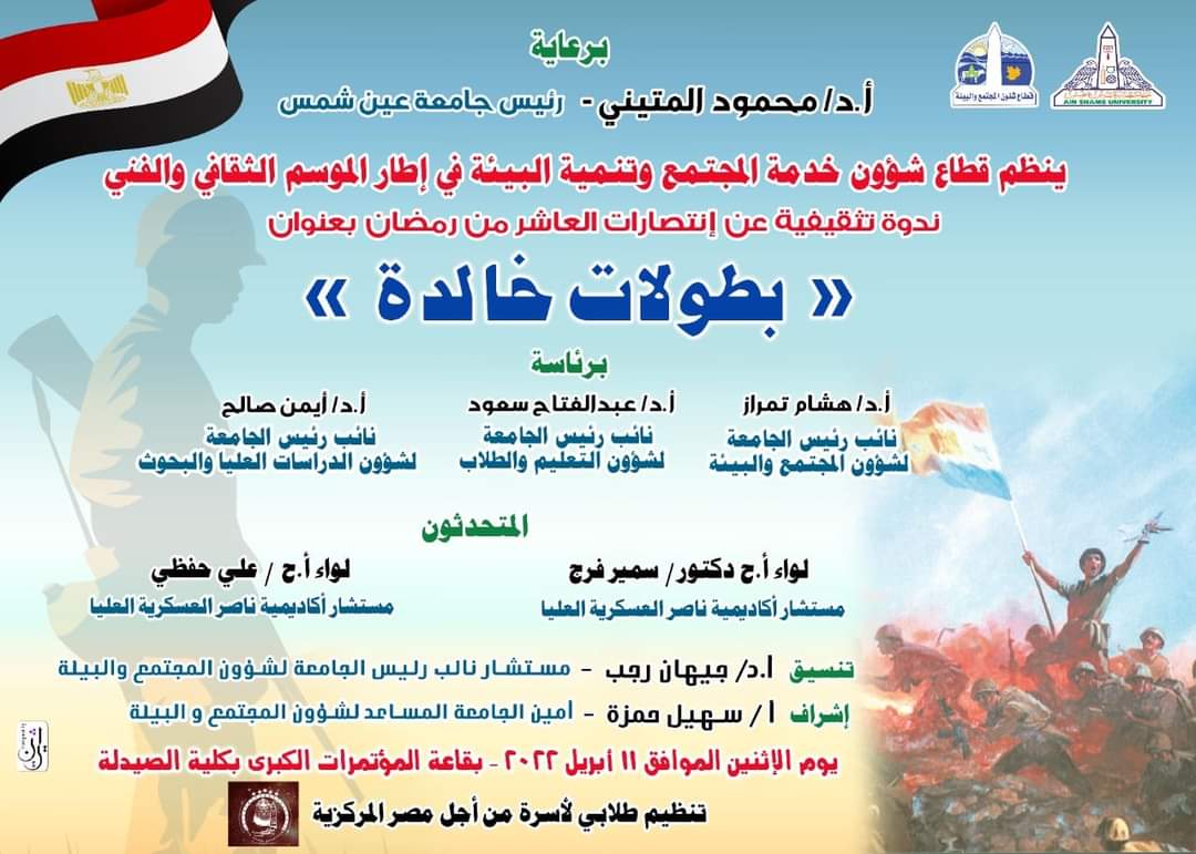 " بطولات خالدة" وذلك يوم الإثنين المقبل الموافق ١١ من أبريل في تمام الساعة الحادية عشر و النصف صباحا بقاعة المؤتمرات الكبرى للجامعة بحرم كلية الصيدلة.