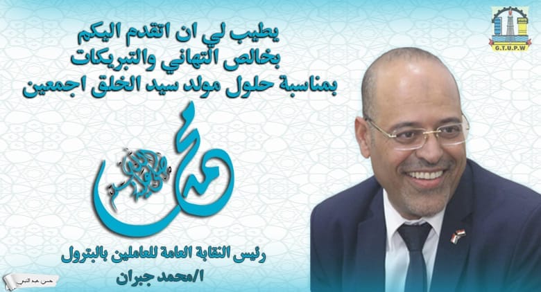 بمناسبة الإحتفال بالمولد النبوي الشريف أرسل السيد محمد جبران رئيس النقابة العامة للعاملين بالبترول و نائب رئيس الاتحاد العام لنقابات عمال مصر برقية تهنئة للسيد الرئيس عبد الفتاح السيسي رئيس الجمهورية جاء فيها :