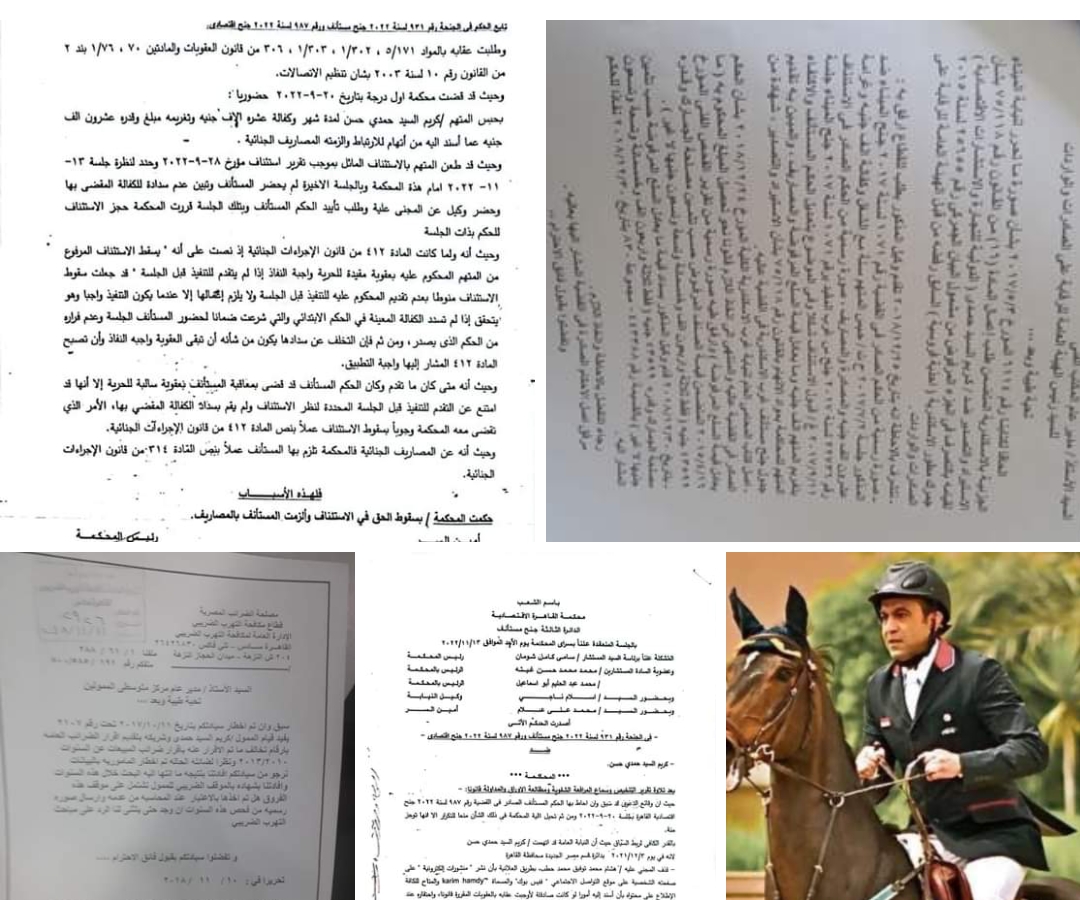 ضربة قاضية تلقاها كريم السيد حمدى حسن الشهير بكريم حمدى المرشح السابق على منصب الرئاسة فى انتخابات اتحاد الفروسية الأخيرة "والذى تم استبعاده منها لسوء السلوك" ، بعد أن أصدرت محكمة القاهرة الأقتصادية الدائرة الثالثة جنح مستئناف حكمها النهائى فى الجنحة رقم 931 لسنة 2022 جنح مستئناف ، ورقم 987 لسنة 2022 جنح اقتصادى التى أقامها المهندس هشام حطب رئيس الاتحادين المصرى والإفريقي للفروسية. ورئيس مجلس إدارة اللجنة الأوليمبية والتى قضت بحبس كريم حمدى لمدة شهر وكفالة مالية قدرها عشرة الالف جنيه ، وتغريمه مبلغ مالى قدره عشرون ألف جنيه عما أسند إليه من إتهام ، والزمته بالمصروفات الجنائية .
