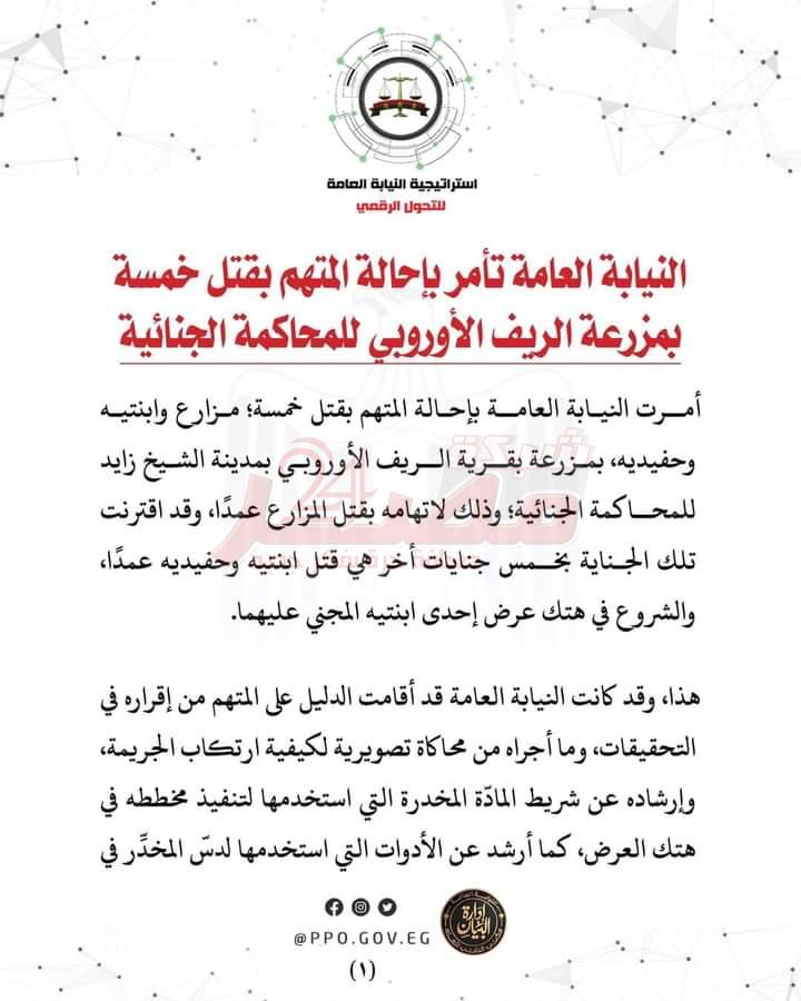 عاجل.. إحالة المتهم بقتل خمسة بمزرعة الريف...
