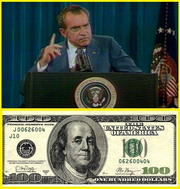 وجمعت الدول في خزائنها أكبر قدر من الدولارات على أمل تحويله لقيمته من الذهب في أي وقت أرادوا، واستمر الوضع على هذا حتى خرج الرئيس نيكسون في السبيعينات على العالم فجأة في مشهد لا يُتصور حتى في أفلام الخيال العلمي ليصدم كل سكان الكرة الأرضية جميعا بأن الولايات المتحدة لن تسلم حاملي الدولار ما يقابله من ذهب