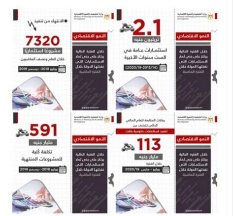 الانتهاء من تنفيذ 7320 مشروعًا استثماريًا خلال العام ونصف الماضيين من يوليو 2018- ديسمبر 2019 بتكلفة كُلية 591 مليار جنيه للمشروعات المنتهية