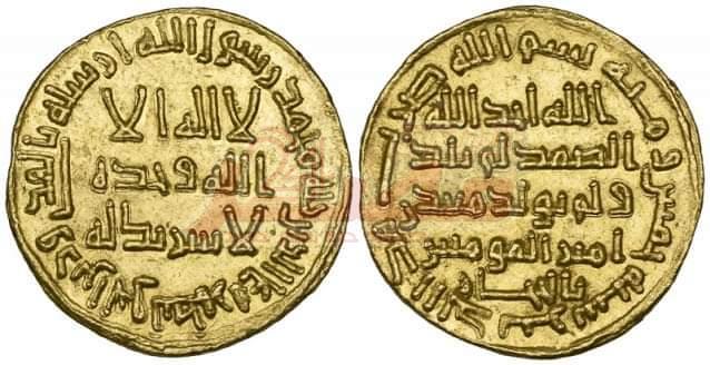 وفي بداية حكم عبد الملك بن مروان كانت الدنانير الاسلامية على غرار الدنانير البيزنطية مع بتر أعلى الصليب وظهر حرف " T " محاطاً بعبارات التوحيد بالخط الكوفي . والوجه الآخر كانت صور هرقل وابنيه قنسطنين وهرقليانوس . وعموداً قائماً على المدرج الذي يحمل الصليب .