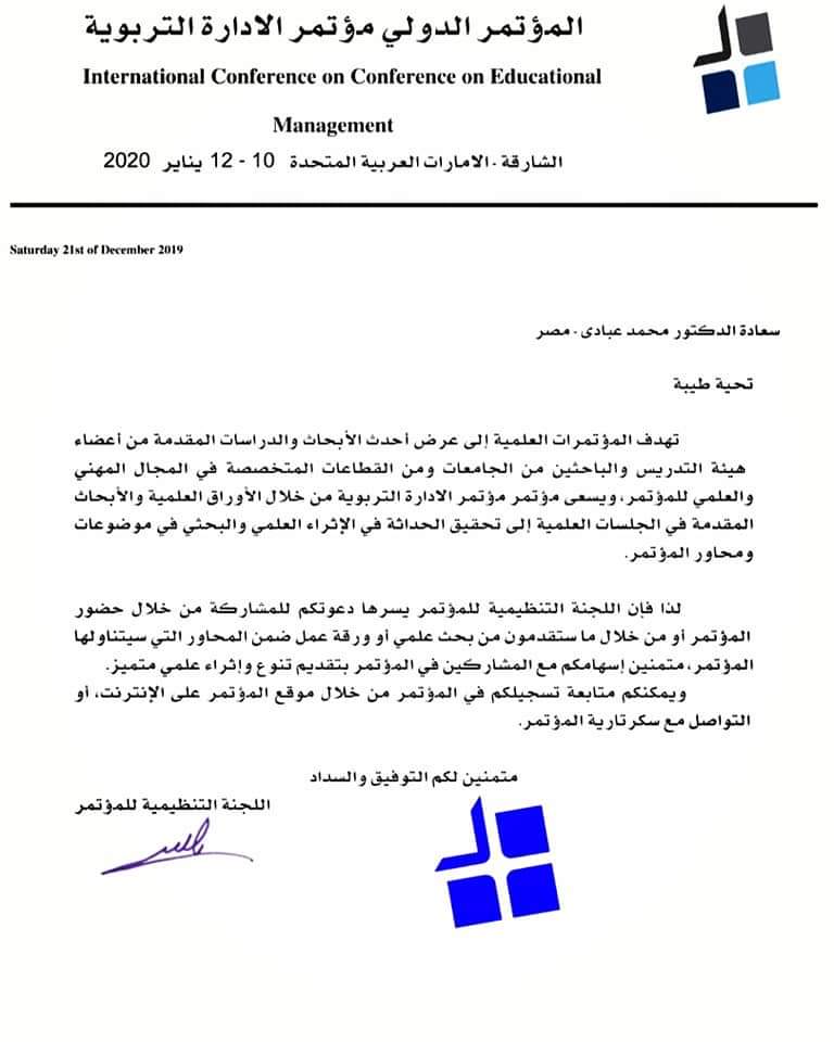 يسافر الخبير الزراعى الدكتور محمد عبادى الى الامارات للمشاركة فى مؤتمر الادارة التربوية بالشارقة