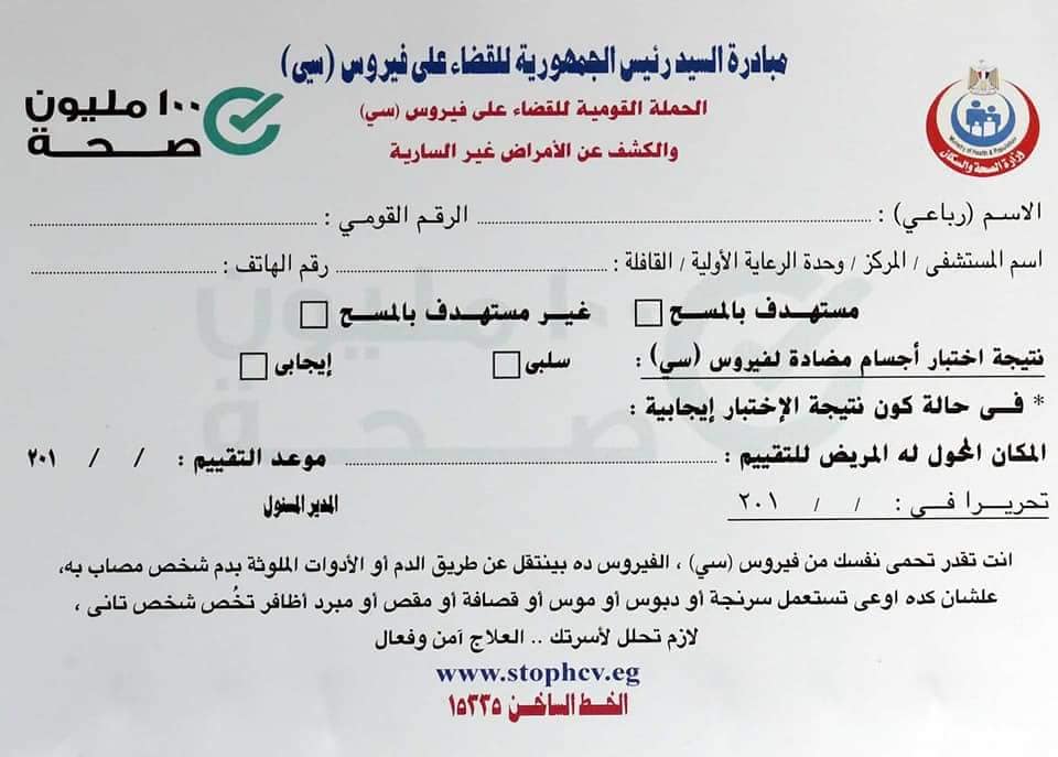 وفى بداية اللقاء، عرضت وزيرة الصحة تقريراً حول مبادرة فحص فيروس"سي"، حيث أوضحت الوزيرة أن المبادرة سيتم تنفيذها على مستوى محافظات الجمهورية على ثلاث مراحل بداية من أكتوبر المقبل حتى نهاية ابريل القادم، مشيرة إلى الموقف التنفيذى للحملة القومية للقضاء على فيروس "سي" والكشف عن الامراض غير السارية، موضحة أنه تم فى هذا الصدد توقيع بروتوكول تعاون بين وزارة الصحة والسكان والهيئة الوطنية للانتخابات لاستخدام قاعدة بيانات الناخبين لتحديد المستهدفين بعملية المسح الطبى الشامل، والذى يقدر عددهم بحوالى 52 مليون مواطن، مضيفه أنه تم اجراء عملية المسح لنحو 5 ملايين مواطن، وتلقى العلاج مليون و800 الف.