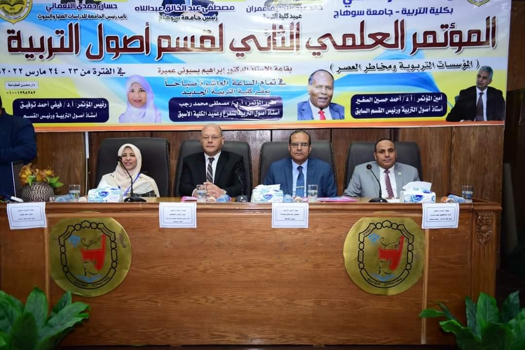 وأكد الدكتور مصطفى رجب مقرر المؤتمر في كلمته أن قسم أصول التربية هو أحد أهم وأقدم أقسام الكلية، وعبر عن فخره وسعادته بانتمائه لهذا القسم العريق، مشيراً إلى أن للمؤسسات التربوية دور هاما في الحفاظ على هوية وتاريخ الأمة، وتتحمل عبء مواجهة كل ما يهدد تراثها ويؤثر على مقدراتها، ومن أهم المخاطر التي تواجهها هو سعي الدول المتقدمة إلى فرض سيطرتها على غيرها من الأمم من خلال بث أفكار ومستحدثات تهدد موروثاتها من عقيدة وقيم ومبادئ، لذا يجب على تلك المؤسسات مواجهة هذه المخاطر وضحدها من خلال نظم ومناهج حديثة مواكبة لهذه التطورات وتحافظ في نفس الوقت على تراثها العقائدي وقيمها وأخلاقها.