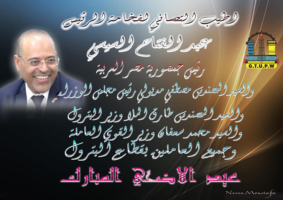 هنأ السيد محمد جبران رئيس النقابة العامة للعاملين بالبترول ونائب رئيس الاتحاد العام لنقابات عمال مصر، فخامة الرئيس عبد الفتاح السيسي رئيس الجمهورية والأمة الإسلامية والعاملين بقطاع البترول بمناسبة حلول عيد الأضحى المبارك أعاده الله على مصرنا الحبيبة بالخير واليمن والبركات، داعياً المولى عز وجل أن يحفظ مصر وشعبها ورئيسها قائد ثورة العمل والتنمية.