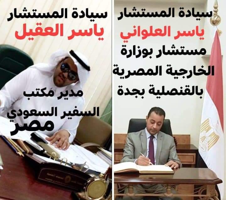 تقدم سيادة المستشار /ياسر العقيل مدير مكتب معالي السفير السعودي بوزارة الخارجية السعودية بمصر إلي سيادة المستشار /ياسر العلواني مستشار بوزارة الخارجية المصرية بقنصلية جدة بالسعودية مغلفة بالحب والتقدير والإحترام بين الشعبين الشقيقين (السعودية ومصر) وكان نصها رغم بساطته معبراً ورائعا ودليل حب وود متبادل :--