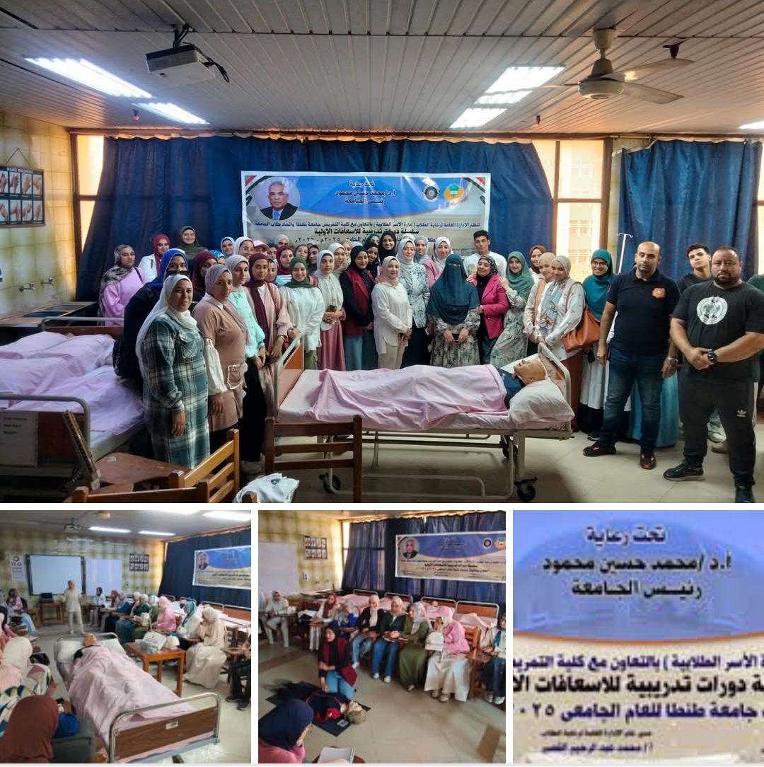 نظمت الإدارة العامة لرعاية الطلاب، إدارة الأسر الطلابية بالتعاون مع كلية التمريض " قسم التمريض الباطنى والجراحى" بجامعة طنطا سلسلة دورات تدريبية عن الاسعافات الاولية لطلاب وطالبات جامعة طنطا للعام الجامعى ٢٠٢٥/ ٢٠٢٦