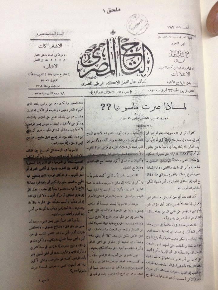 احتوت أوراق الماسونية في مصر على ( أمر عال ) بتاريخ 29 أغسطس عام 1922 يعترض فيه " إدريس راغب " أستاذ أعظم المحفل الأكبر الوطني المصري بشدة على أمر إفشاء أعمال الماسونية في الجرائد السيارة ، فالموضوعات الماسونية تناقش في صحف الماسون فقط ، و يبدو أنه قصد بصحف الماسون تلك التي كان يمتلكها الماسون دون غيرها ، أو المتخصصة التي تصدر عن الشروق الماسونية و محافلها تحت السلطة العامة للمحفل الأكبر الوطني المصري . و لقد صدر ذلك الأمر حينما نشر الماسوني " محمد مصطفى عبده " مقالا بعنوان " في الماسونية " بجريدة " وادي النيل " الغير متخصصة في الماسونية في عددها الصادر في 27 أغسطس 1922 . و أمر " إدريس راغب " في نهاية اعتراضه الرسمي بإيقاف " محمد مصطفى عبده " عن الأعمال الماسونية و أوصى بلزوم محاكمته . و أعلنت " المجلة الماسونية " في إحدى الأعداد بأنها ترجو كل أخ ماسونى يريد نشر أي مقالة علمية أو أدبية أو ماسونية أن يرسلها على الجريدة مباشرة ، و بالتالي لا يسمح لغير الماسون بالنشر في الصحف الماسونية كما لا يسمح بعكس ذلك .