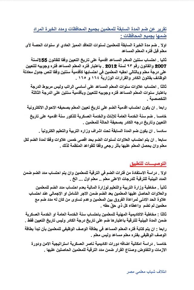 واوضح محمد البيلي منسق عام ائتلاف تمرد شباب معلمي مصر بسيناء ان الائتلاف انتهى من تقرير عن ضم المدة السابقة بجميع محافظات مصر والمطالب التي يناشد المعلمين بتحقيقها في ضم المدة والتوصيات المقترحة للتطبيق وان هناك محافظات ضمت المدة مثل المنوفية والاسماعيلية وقنا وكفر الشيخ والبحيرة والغربية وهناك محافظات ضمت الخدمة العامة والعسكرية فقط مثل المنيا وبني سويف وبالرغم من صدور العديد من القرارات المنظمة لضم المدة من هيئة التنظيم والأدارة وأحقية المعلمين في ضم مدد العمل السابقة لهم الا انه للأسف لحد الأن لم تنفذ هذه القرارات ولقد تعب شباب المعلمين من هذه المماطلة بلا عائد لحد الأن .