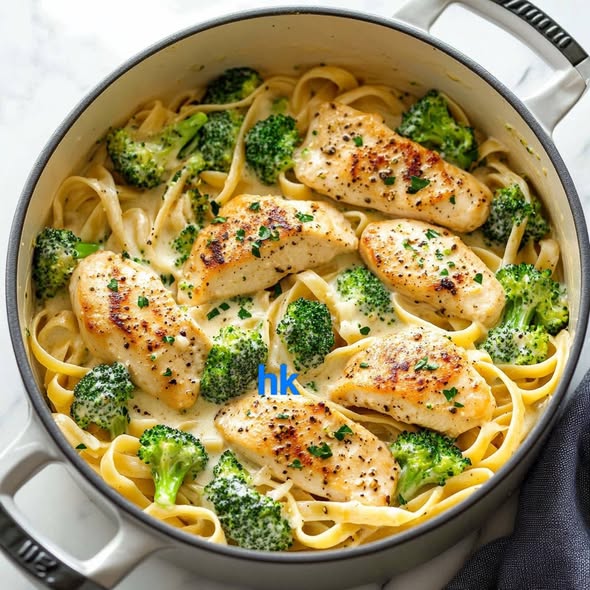 أضيفي الفيتوتشيني ومرق الدجاج، واتركي المزيج حتى يغلي. خففي النار واتركيه على نار هادئة لمدة 10 دقائق تقريباً مع التقليب من حين لآخر، حتى تنضج المعكرونة وتصبح طرية.