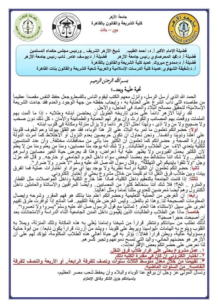 أولاً : حضراتكم تعلمون ما تمر به البلاد علي إثر هذا الوباء فقد عم القلق بيوتنا وعم الخوف قلوبنا علي أهلنا وذوينا وأنفسنا ونحن نحاول أن نكون حريصين بعدم النزول أو الإختلاط كما قررت الدولة ووزارة الصحة والسكان و حضراتكم كما تعلمون أن الكثير منا يأتي من محافظات مختلفة وأن عدد المنتسبين للكلية يتعدي آلاف من الطلاب والطالبات ولا شك أنه يوجد منا مصابين بكورونا ولا نعلم لأن الكثير يحمل الفيروس ولا يظهر عليه أية أعراض وهذا قد يعرض حياة الغير مصابين وأسرهم للخطر ولا شك أننا سنختلط مع بعضنا البعض سواء داخل الحرم الجامعي أو خارجه.. و قال الله عزل وجل "ولا تلقوا بإيديكم إلي التهلكة وقال رسول الله صل الله عليه وسلم "لا ضرر ولا ضرار".